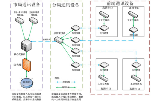 傳輸網(wǎng)絡(luò)系統(tǒng)主要實現(xiàn)前端網(wǎng)絡(luò)設(shè)備數(shù)據(jù)交換以及前端設(shè)備與中心設(shè)備的通訊,將前端采集信息實時傳輸?shù)街行钠脚_,進行集中存儲和管理。由于監(jiān)控系統(tǒng)中普遍存在覆蓋范圍廣、監(jiān)控點數(shù)多、環(huán)境干擾大、監(jiān)控點流量大、整網(wǎng)流量巨大、實時監(jiān)控多等特性,公司需對不同的系統(tǒng)規(guī)模構(gòu)建不同形態(tài)的高品質(zhì)、低損耗監(jiān)控專用IP網(wǎng)絡(luò),監(jiān)控業(yè)務(wù)獨立專網(wǎng)承載,使用光纖傳輸以保證傳輸速率及運行的穩(wěn)定可靠性。傳輸網(wǎng)絡(luò)系統(tǒng)示意圖如下: